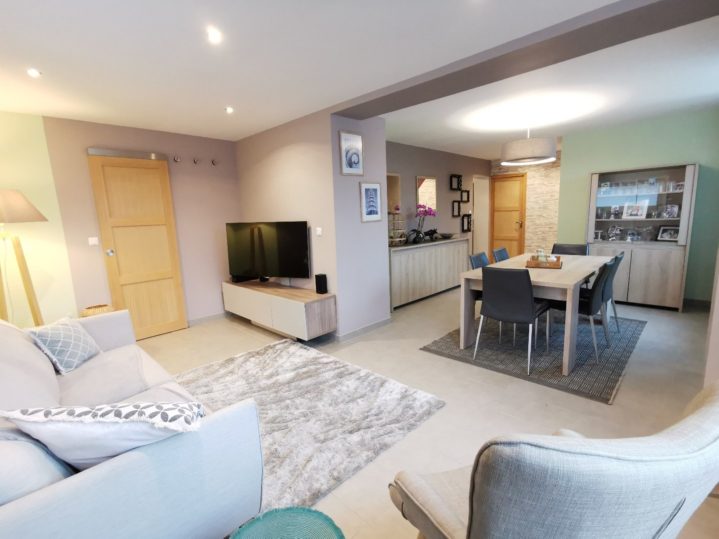Elle se compose d’une entrée, un séjour, une cuisine équipée, une salle d’eau, une buanderie, trois chambres, une pièce dressing, une cave.