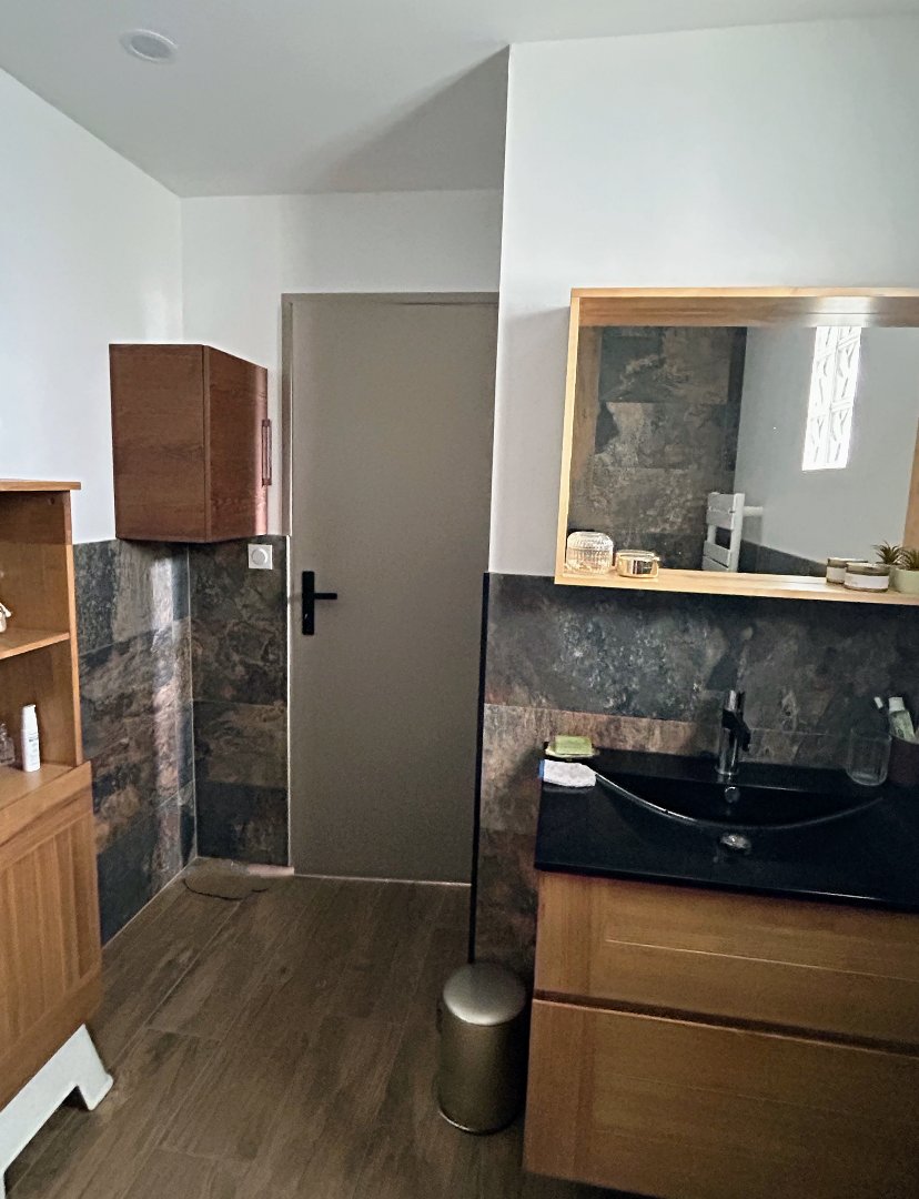 Concernant la partie professionnelle, elle se compose d’une zone d’accueil ou d’un show-room de 60 m² avec vitrine, d’un bureau avec mezzanine, d’une salle de douche et de sanitaires. En complément, vous disposerez de 2 grands garages de 31 m² chacuns.