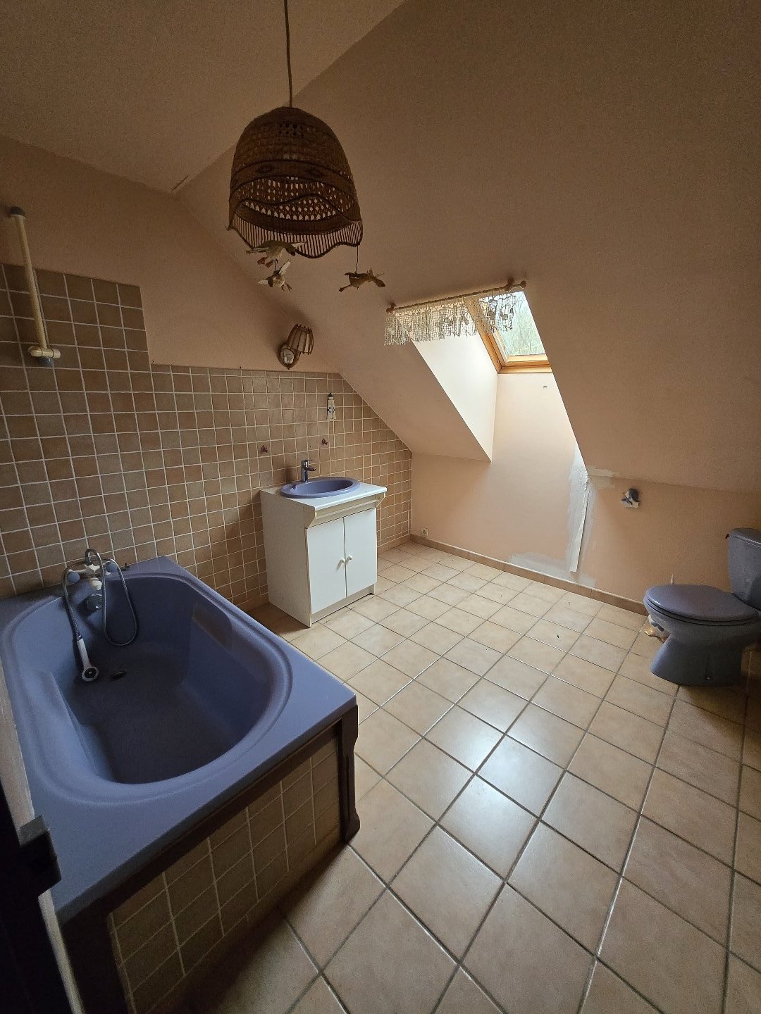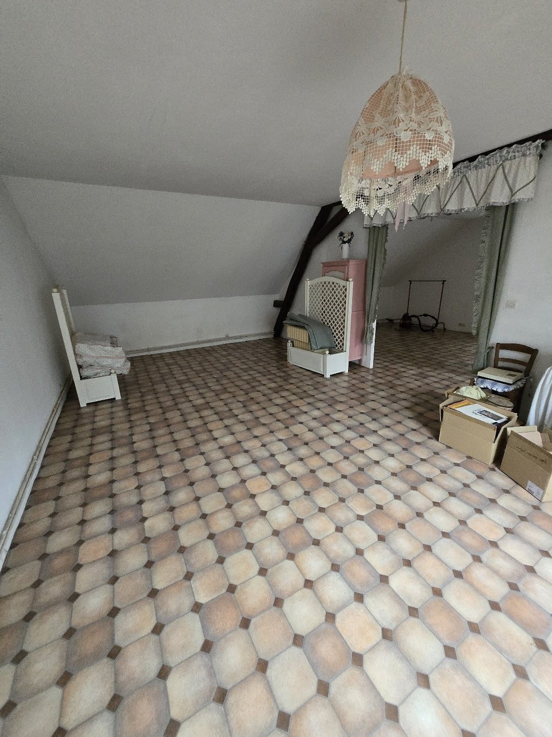 À l’étage, un vaste palier offre de multiples possibilités d’aménagement, que ce soit pour un coin lecture, un bureau ou un espace de jeux. Ce niveau dessert également une grande chambre, ainsi qu’une salle de bain avec WC, idéale pour un confort optimal.