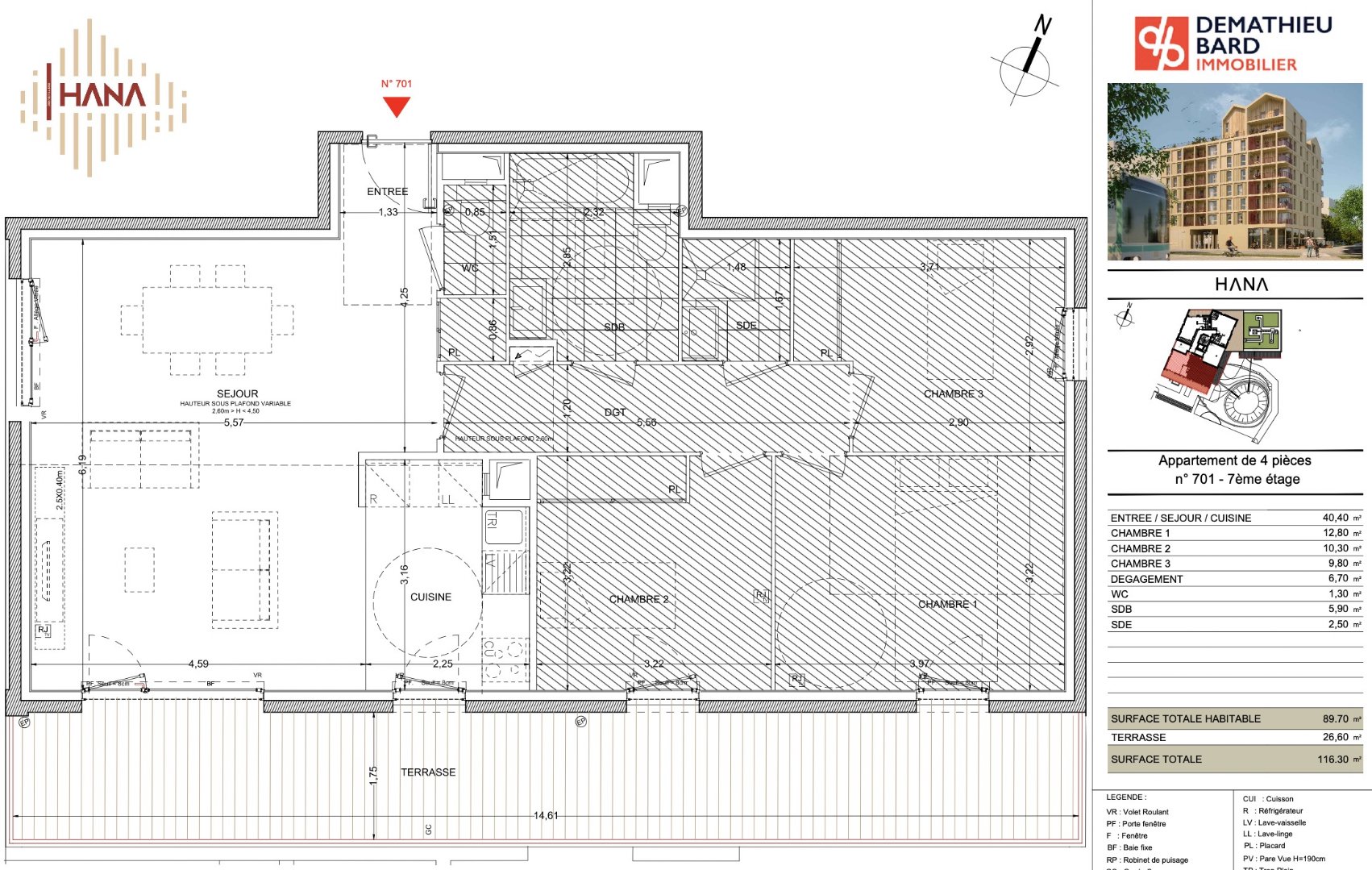 Sublime 4 pièces,avec une grande pièce de vie, 3 chambres avec salle d’eau et salle de bain, un balcon filant de 26m2 situé au dernière étage.