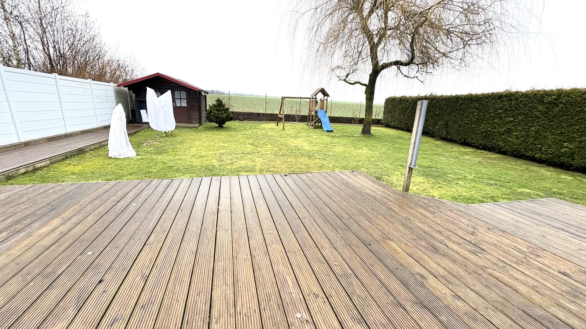 À l’extérieur, laissez-vous charmer par un magnifique jardin sans vis-à-vis, véritable havre de paix. Vous profiterez également d’une terrasse avec une vue dégagée sur les champs, parfaite pour savourer des instants de détente en toute tranquillité.