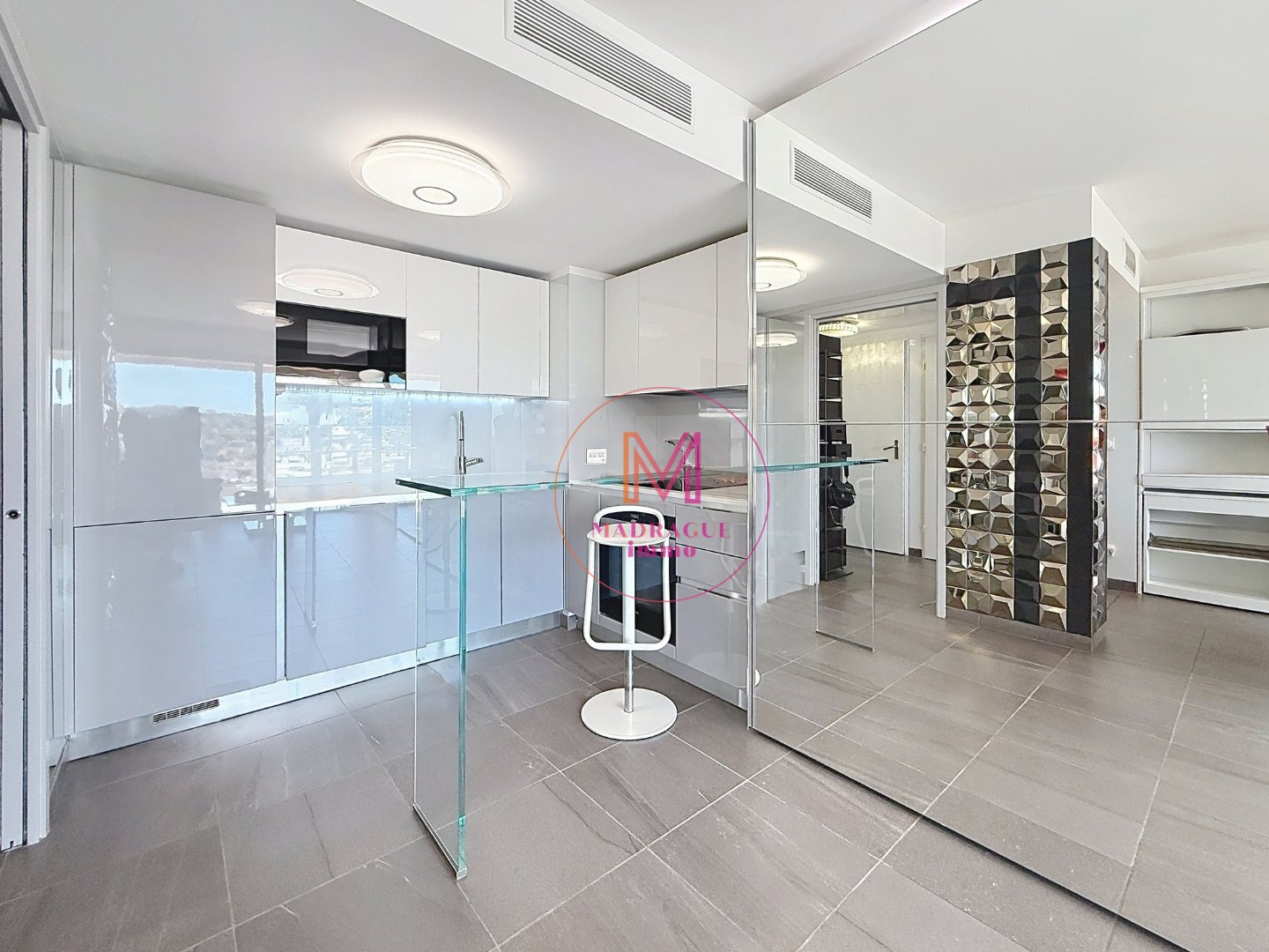 2P réinventé en loft de 43.8 m² avec terrasse, vue panoramique sur la mer et collines.