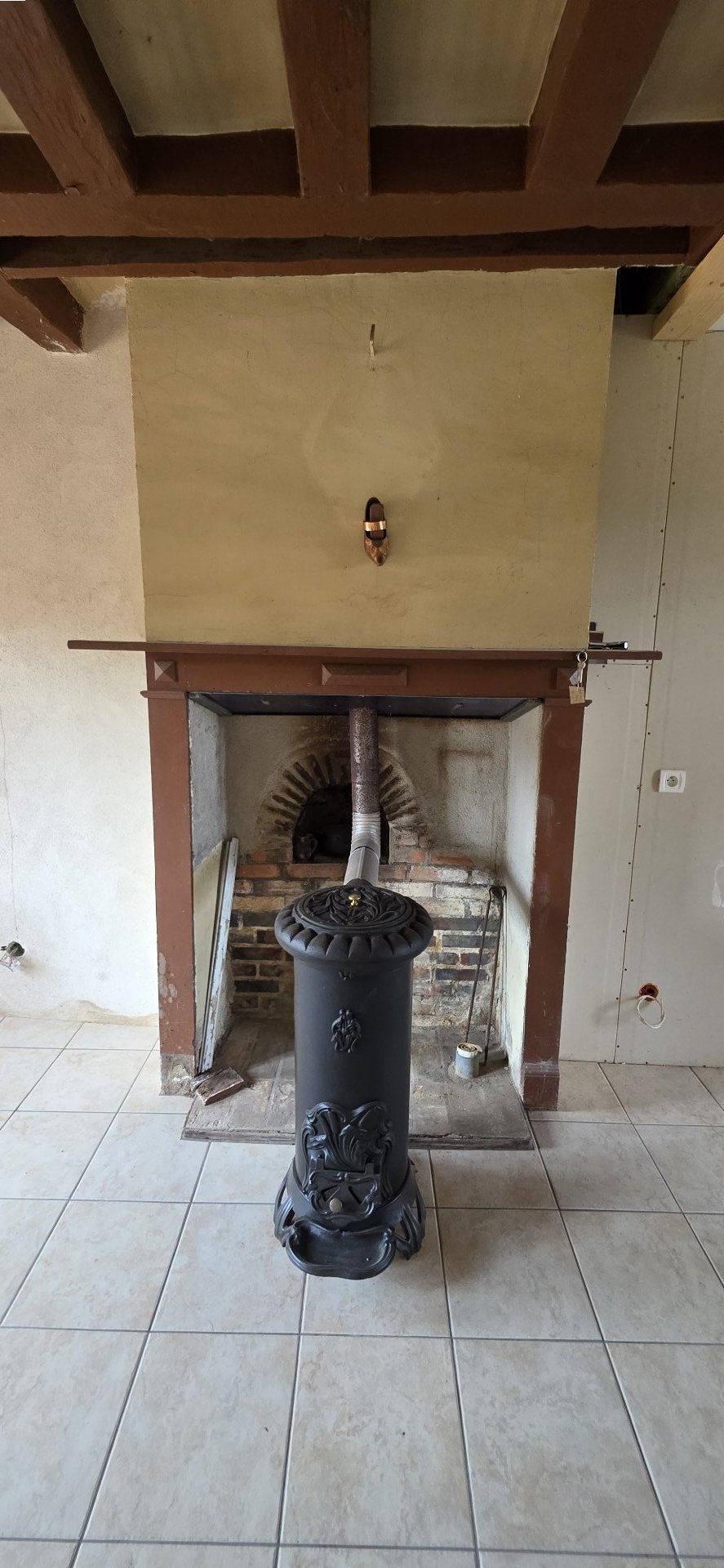 Une pièce de vie lumineuse avec poêle à bois et accès direct à un jardin/cour de 209 m², idéale pour profiter des beaux jours.