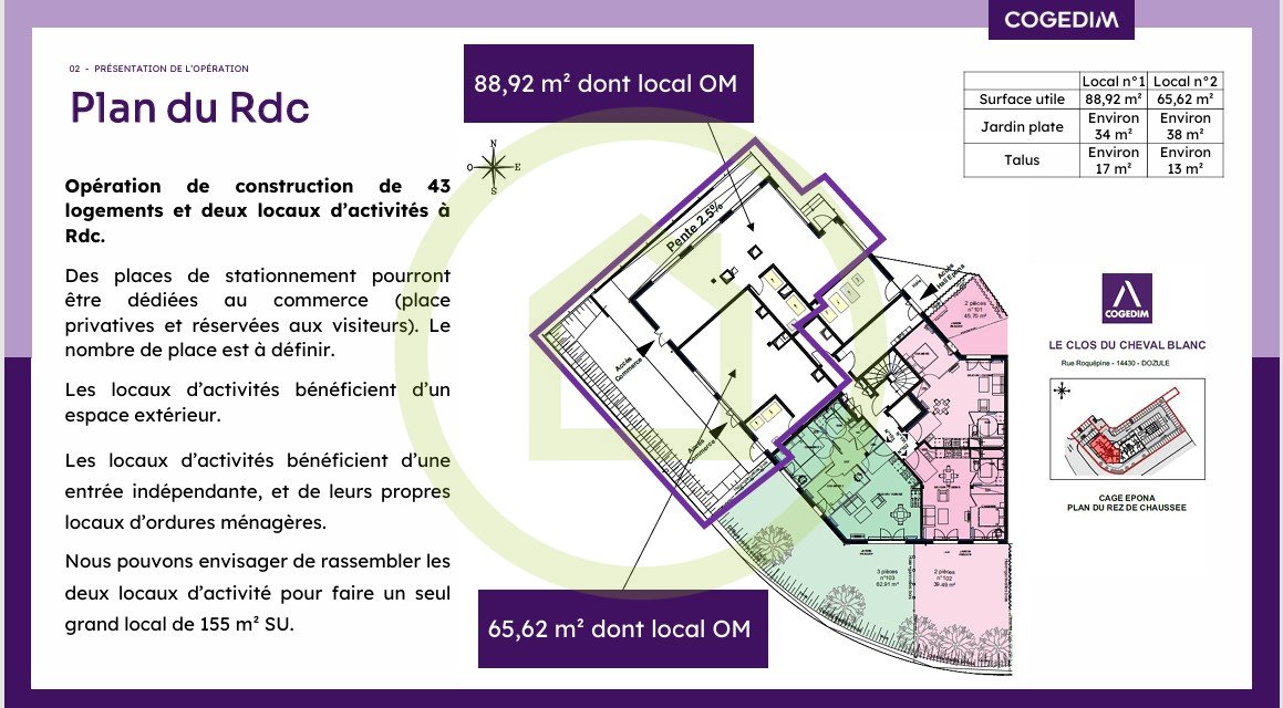Il est possible d’envisager de rassembler les deux locaux d’activités pour faire un seul grand local de 155 m2 de surface utile .
