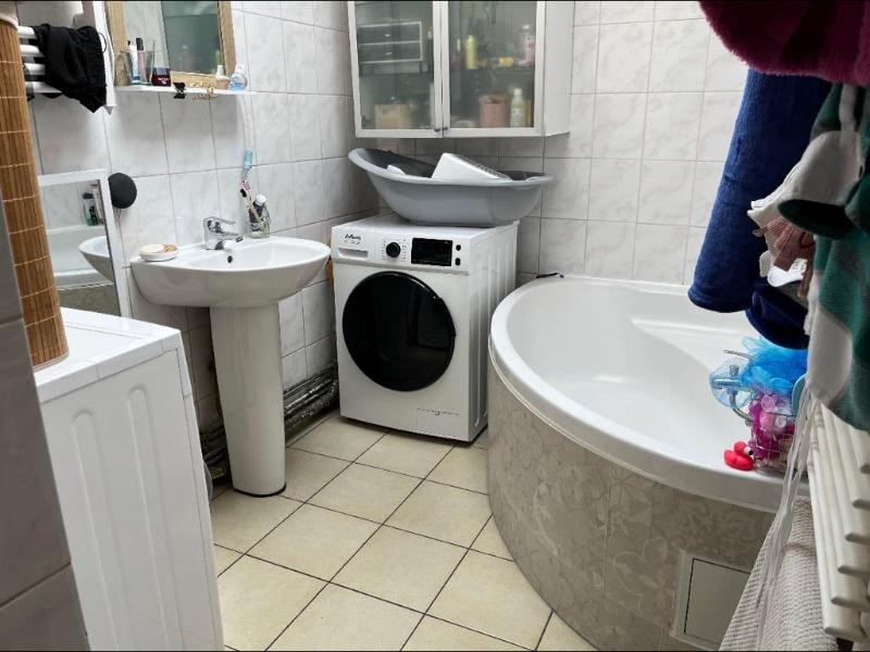 Une salle de bain claire avec avec baignoire d’angle, lavabo, sèche serviette.
