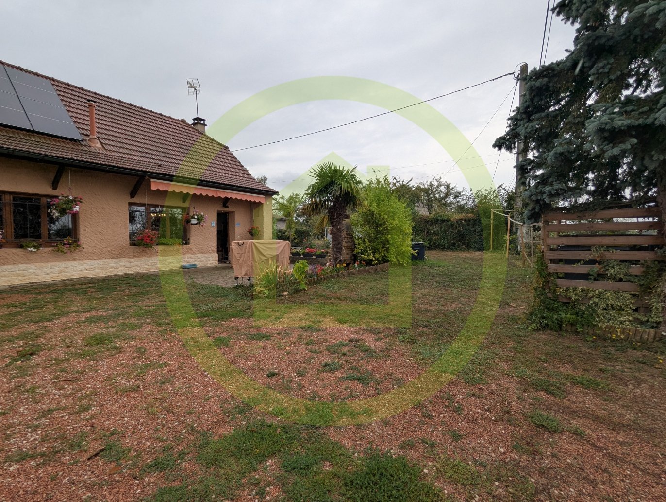 Terrain arboré avec fruitiers, potagé et espace pour piscine.