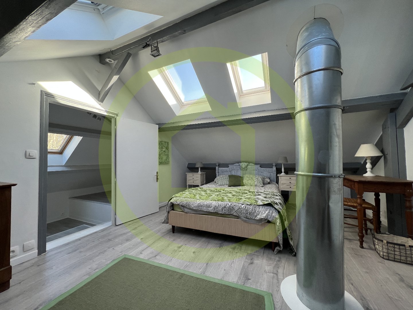Au rez-de-chaussée, vous profiterez d’un séjour lumineux agrémenté d’un poële à bois, d’une cuisine semi-ouverte aménagée, d’une chambre avec rangements, d’une salle de bains avec douche et wc, ainsi qu’une pièce pouvant servir de bureau où un escalier méne à l’étage désservant une chambre, une salle d’eau avec wc.