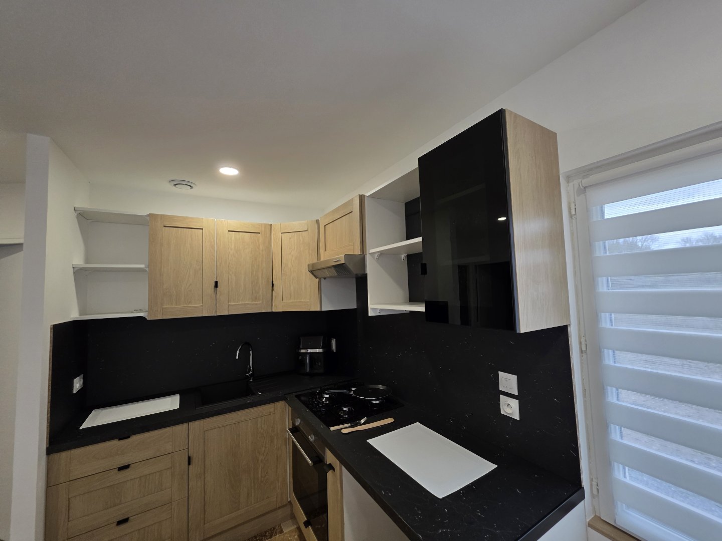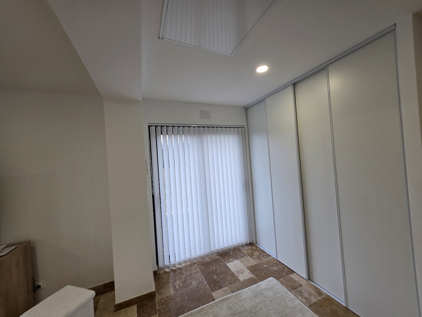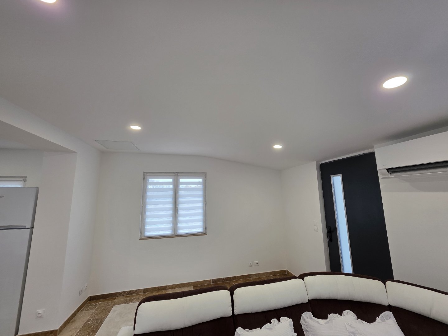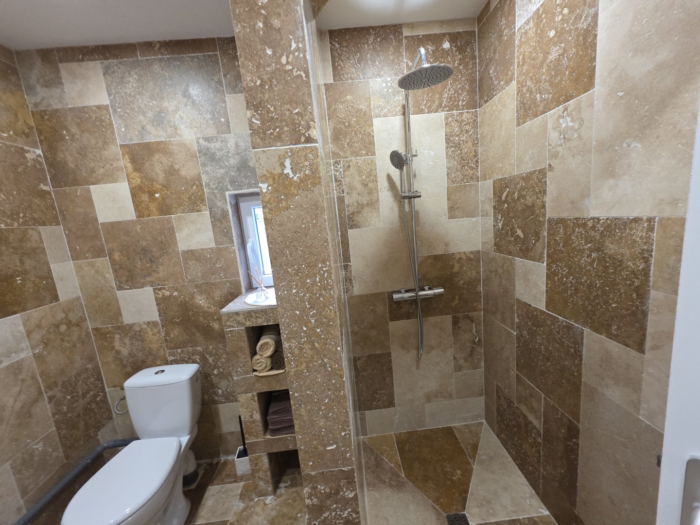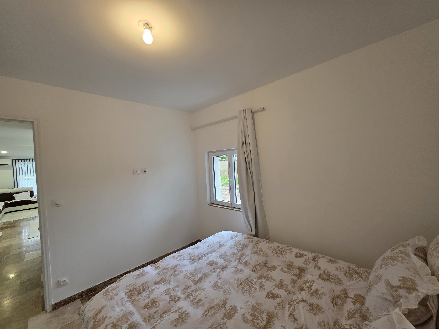 L’intérieur se compose d’un grand salon-séjour lumineux avec coin cuisine, agrémenté de baies vitrées traversantes qui offrent une superbe lumière naturelle tout au long de la journée. La maison dispose de deux chambres et d’une magnifique salle d’eau contemporaine en travertin, avec WC intégré.