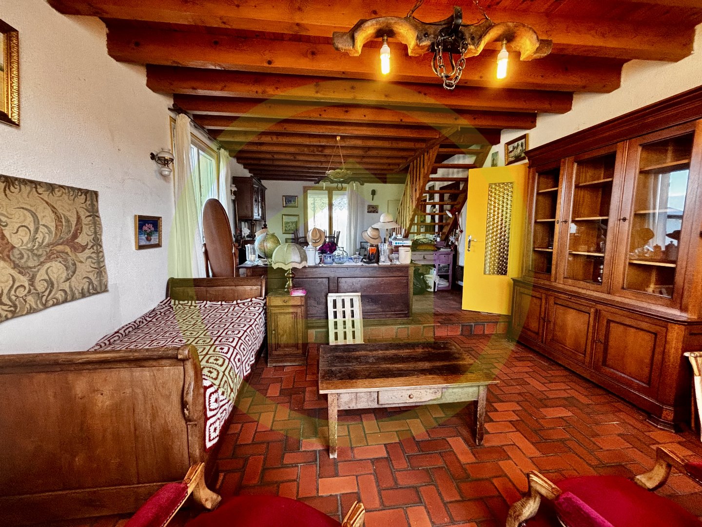 Une véranda abrite les ouvertures sur la cuisine et le salon-séjour. Ce dernier est très lumineux grace à ses trois porte fenètres et vous offre près de 40 m² d’espace de vie avec une cheminée à foyer ouvert actuellement.
