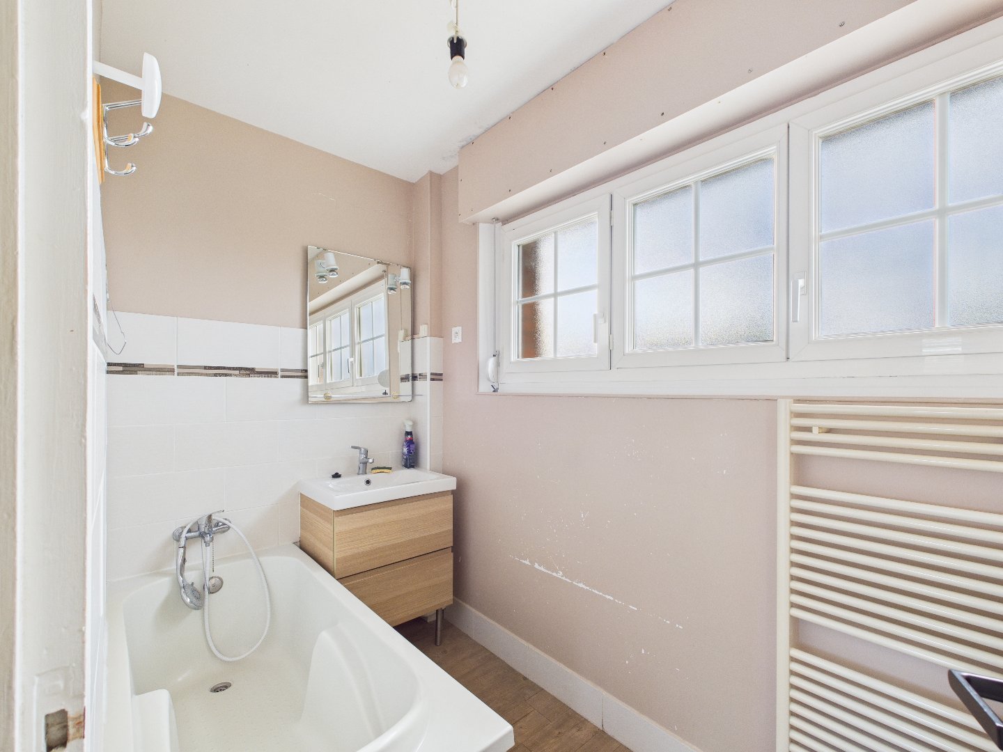 Trois chambres (10 / 13,5 / 9 m²), salle de bain avec baignoire et douche.