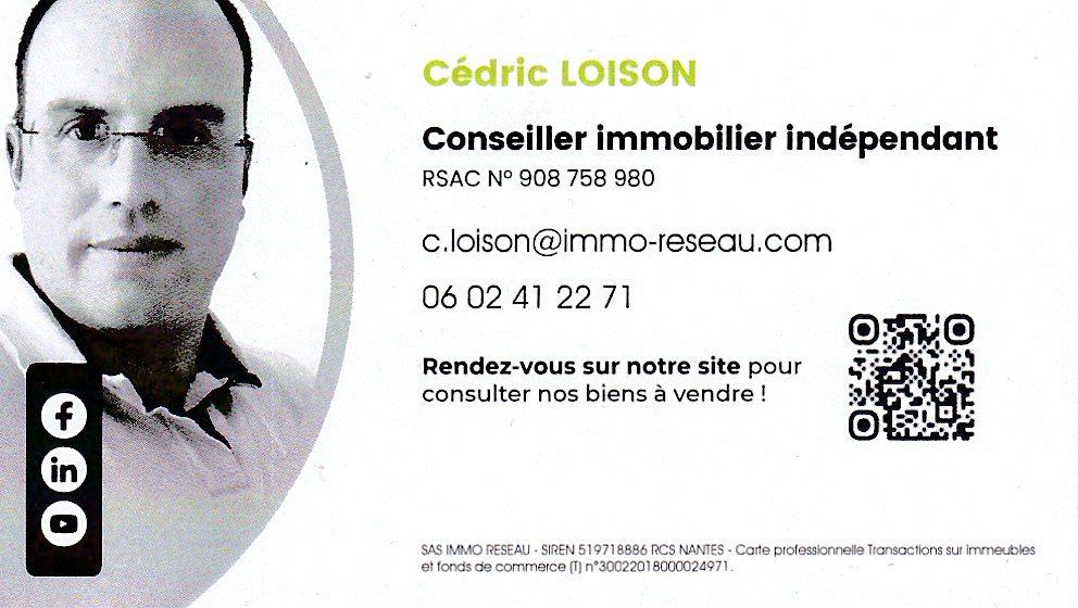 Cette présente annonce a été rédigée sous la responsabilité éditoriale de Cédric LOISON agissant sous le statut d’agent commercial immatriculé au Ville du greffe : SAINTES sous le numéro RSAC N° 908 758 980 auprès de la SAS IMMO RESEAU au capital de 10 000 – Réseau national immobilier sur internet, 44 Allée des Cinq Continents – 44120 VERTOU – RNE NANTES 519 718 886. Carte professionnelle T et G n° CPI 3002 2018 000 024 971 CCI de Nantes-Saint-Nazaire (44)