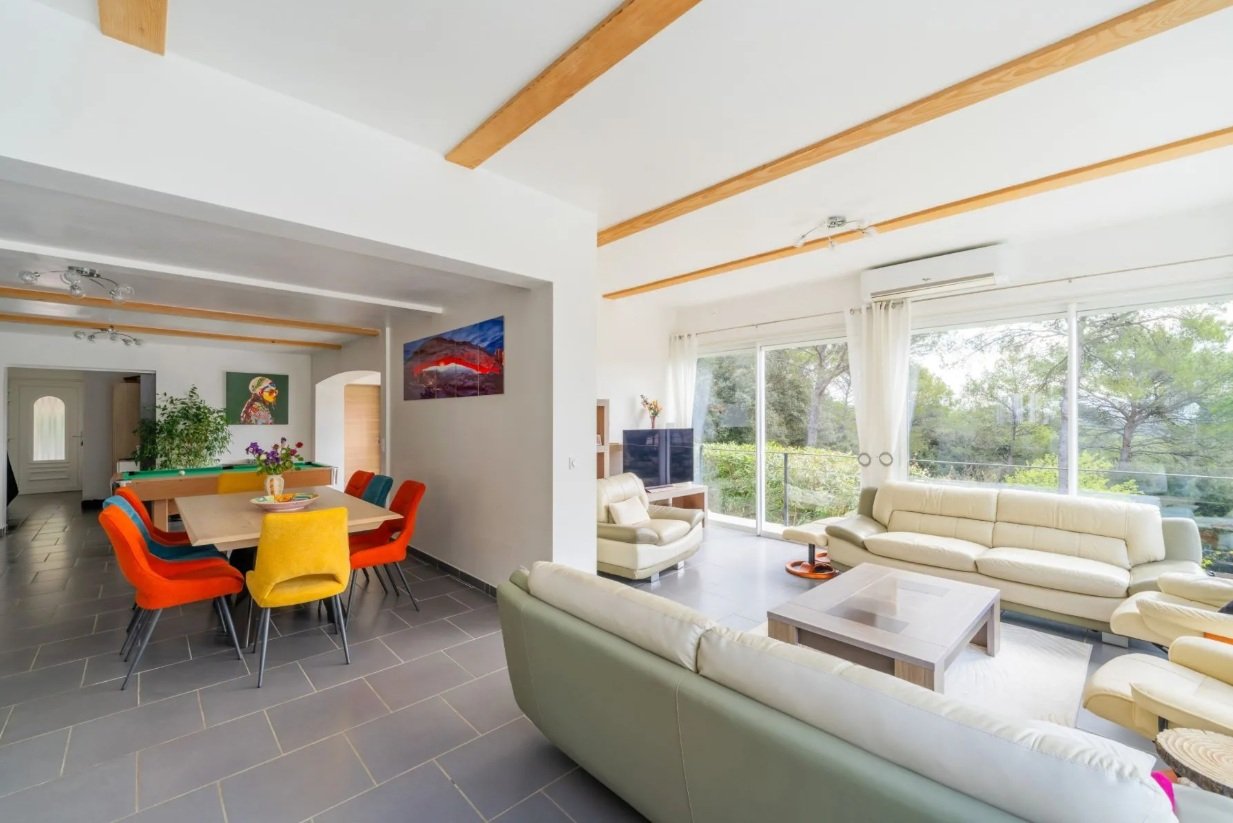 À l’extérieur, la maison s’ouvre sur un terrain de 5 400 m² entièrement clôturé, aménagé en trois restanques, offrant différents espaces de vie et un cadre verdoyant. Une piscine et une terrasse invitent à la détente, tandis qu’un garage pouvant accueillir deux véhicules et des stationnements supplémentaires apportent un réel confort au quotidien.