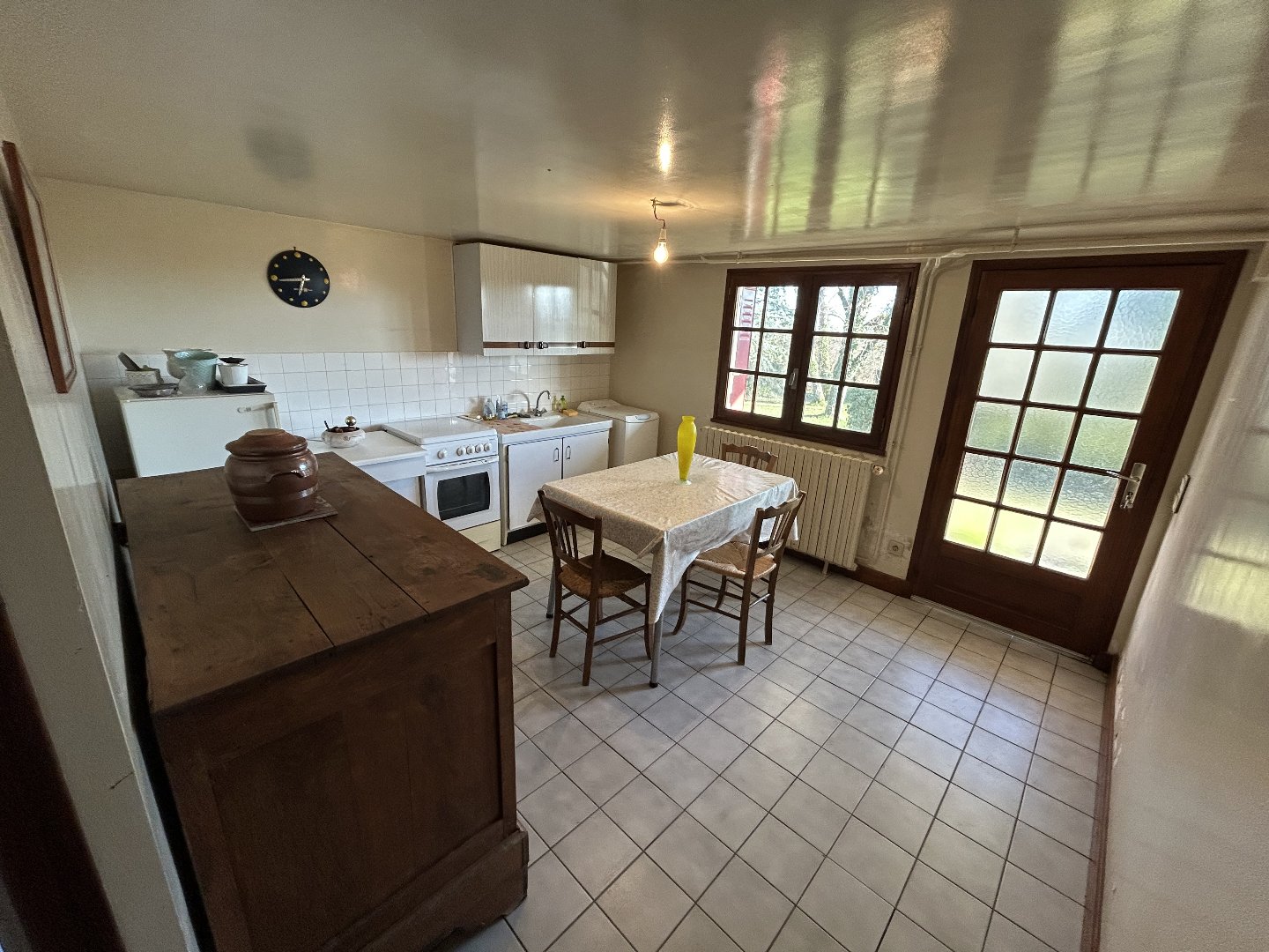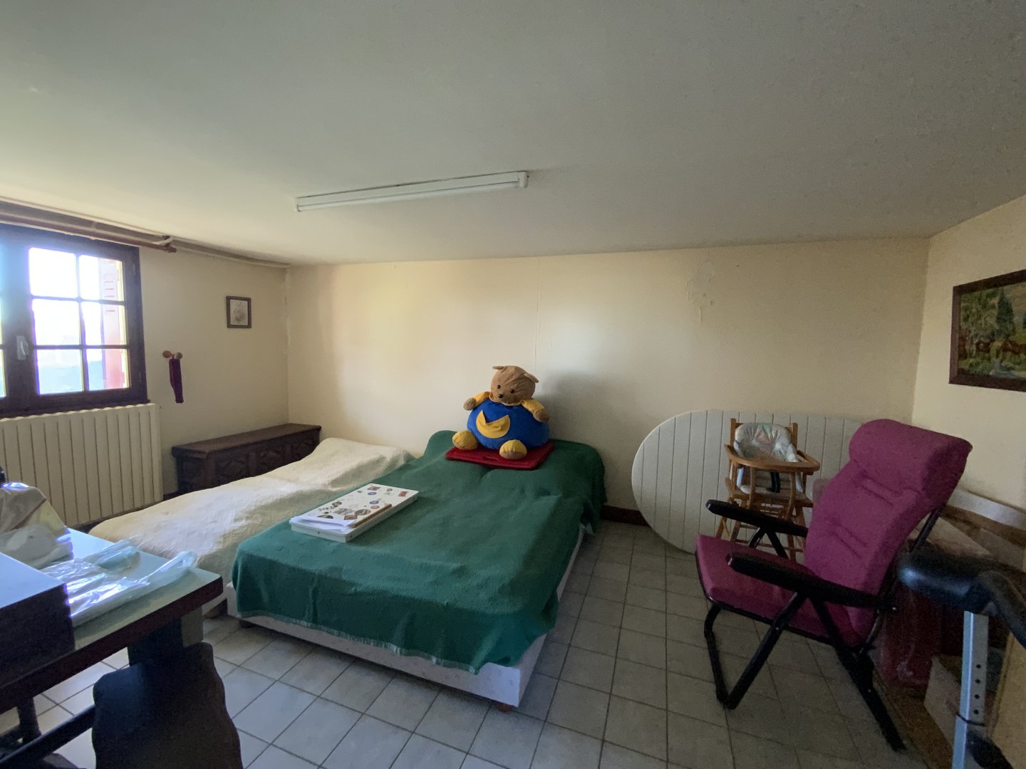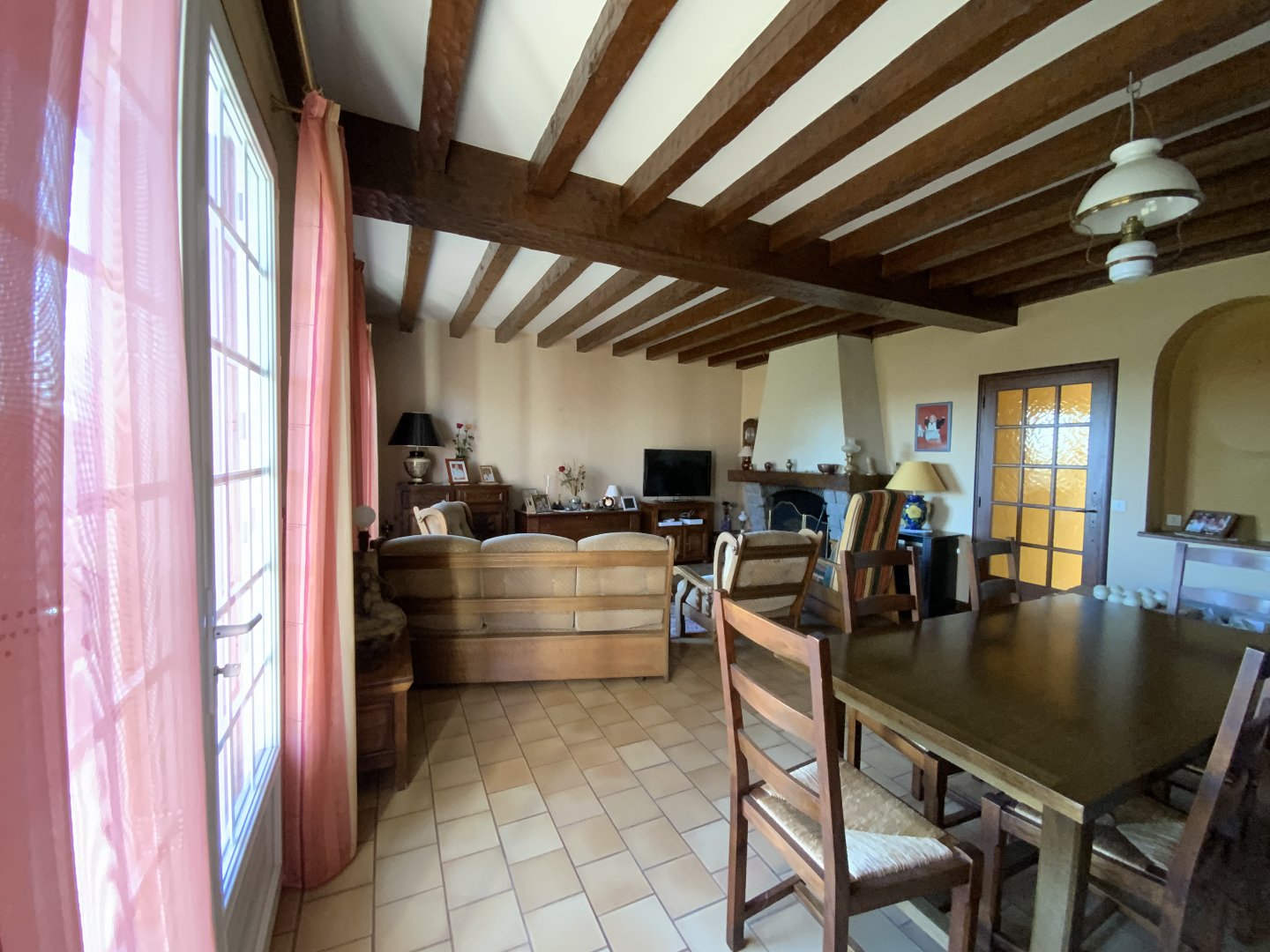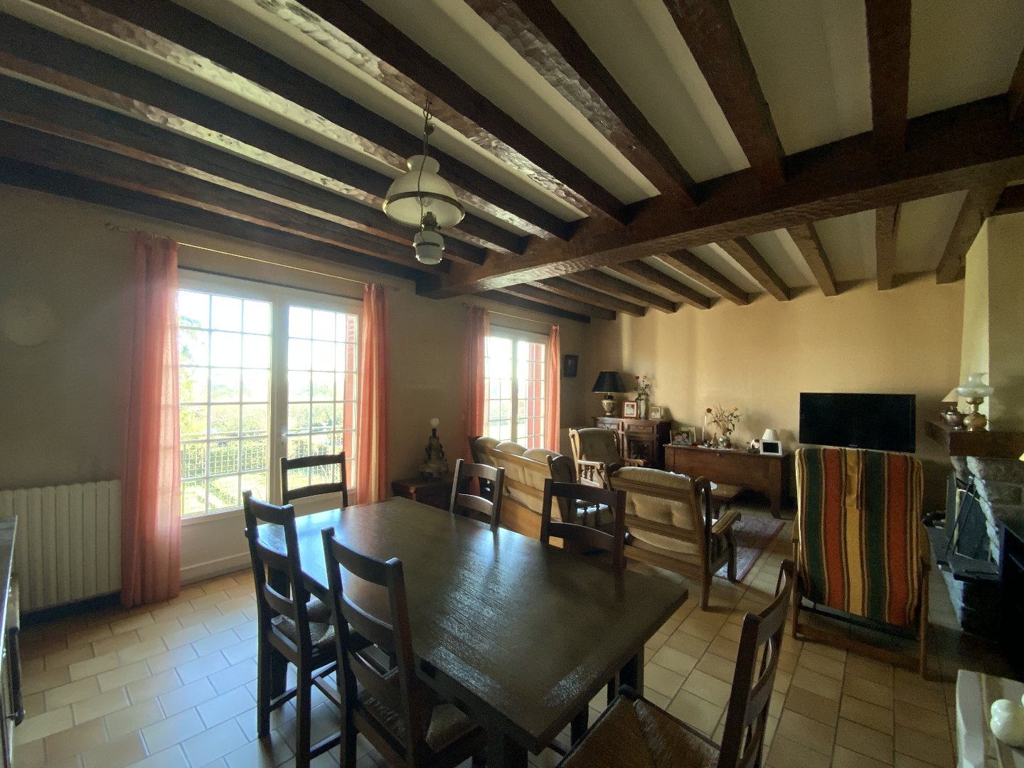 A l’étage, une cuisine aménagée et équipée, un grand séjour salon avec poutres et cheminée, balcon donnant sur le terrain.