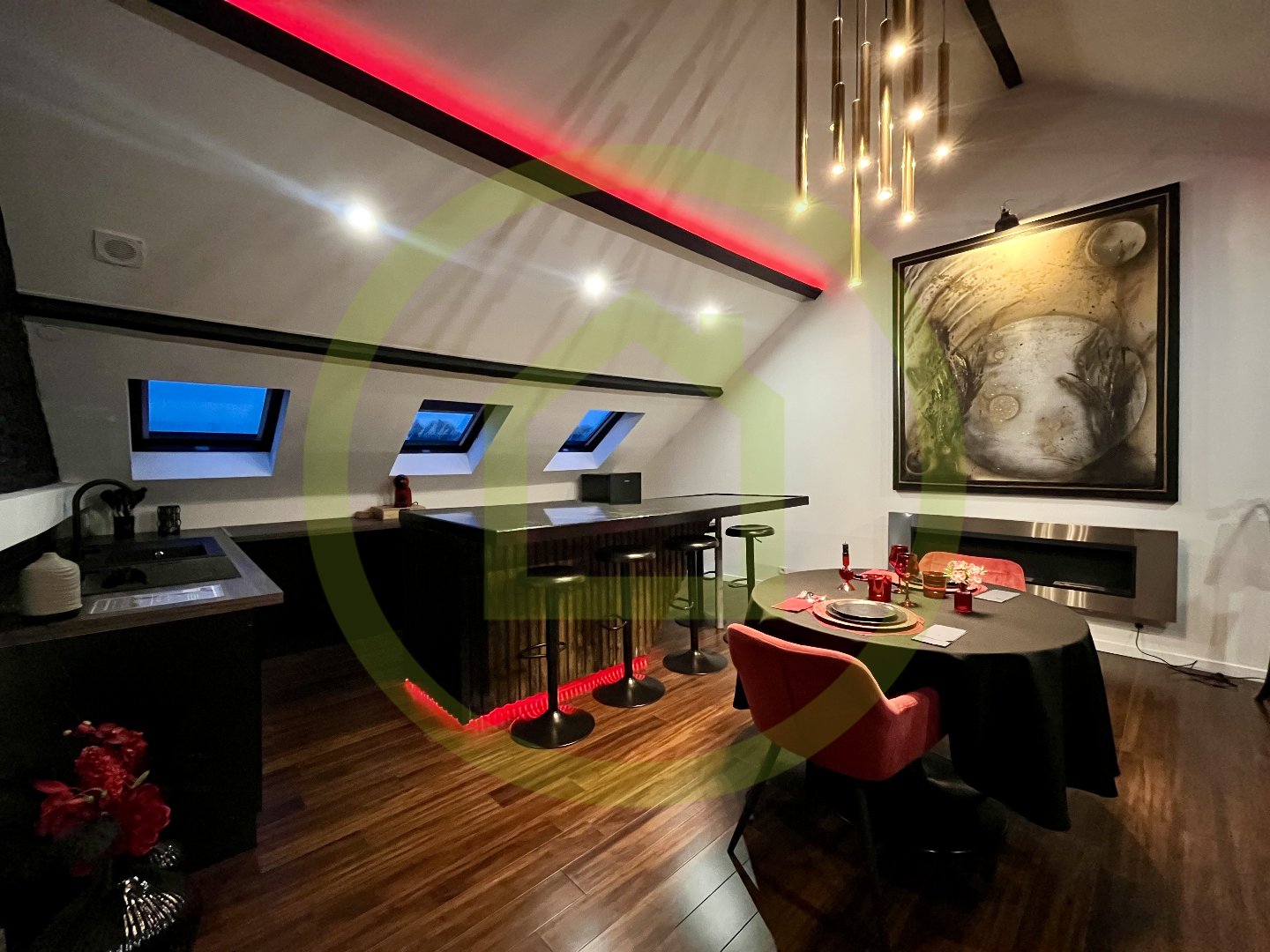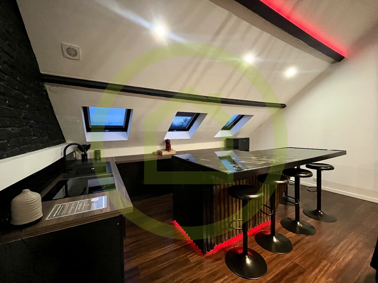 – Cuisine contemporaine, grande salle à manger, salon lumineux, bureau (parfait pour le télétravail), chambre et salle d’eau raffinée.
