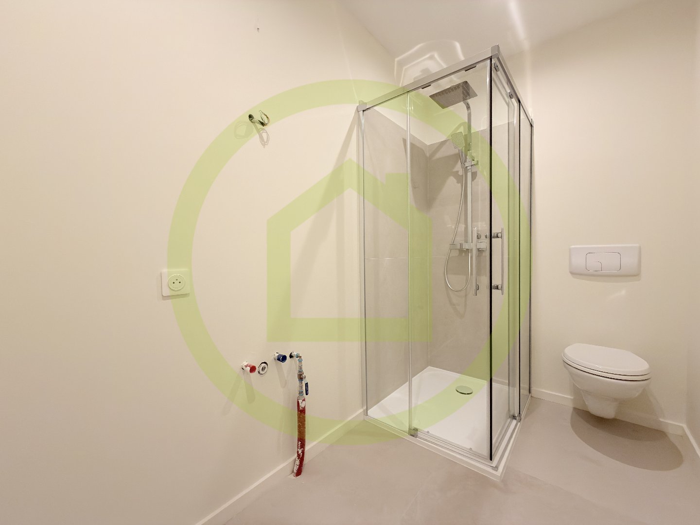 Une salle d’eau avec WC, douche, lavabo et emplacement lave-linge.