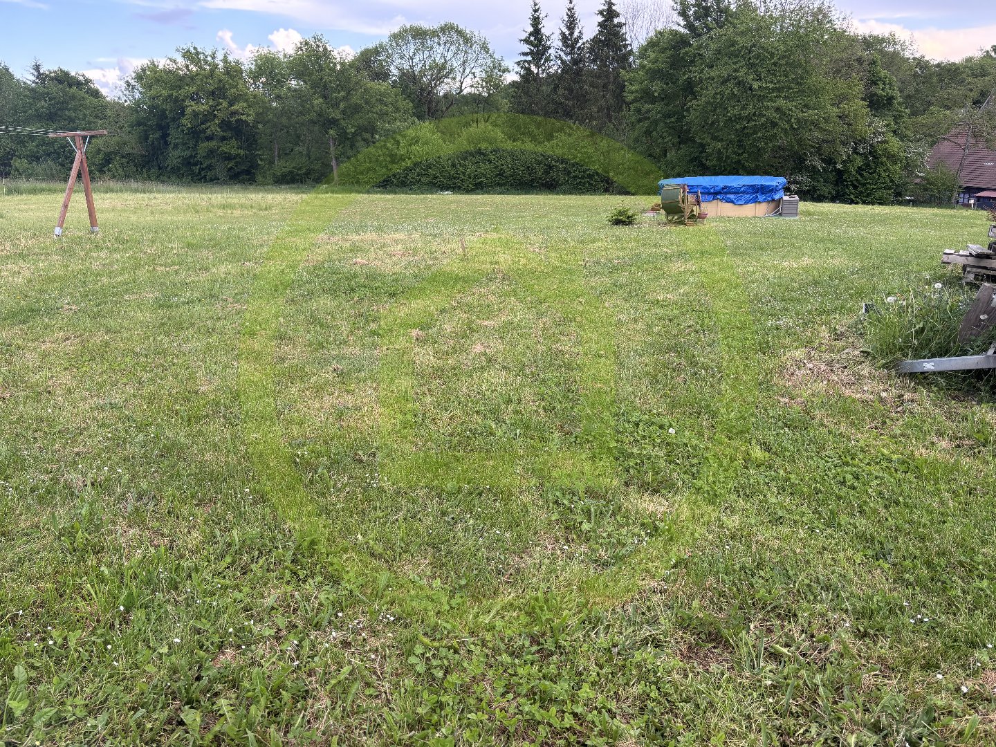 Un appenti sur le coté de la maison avec sol bétonné offre un espace de stockage
