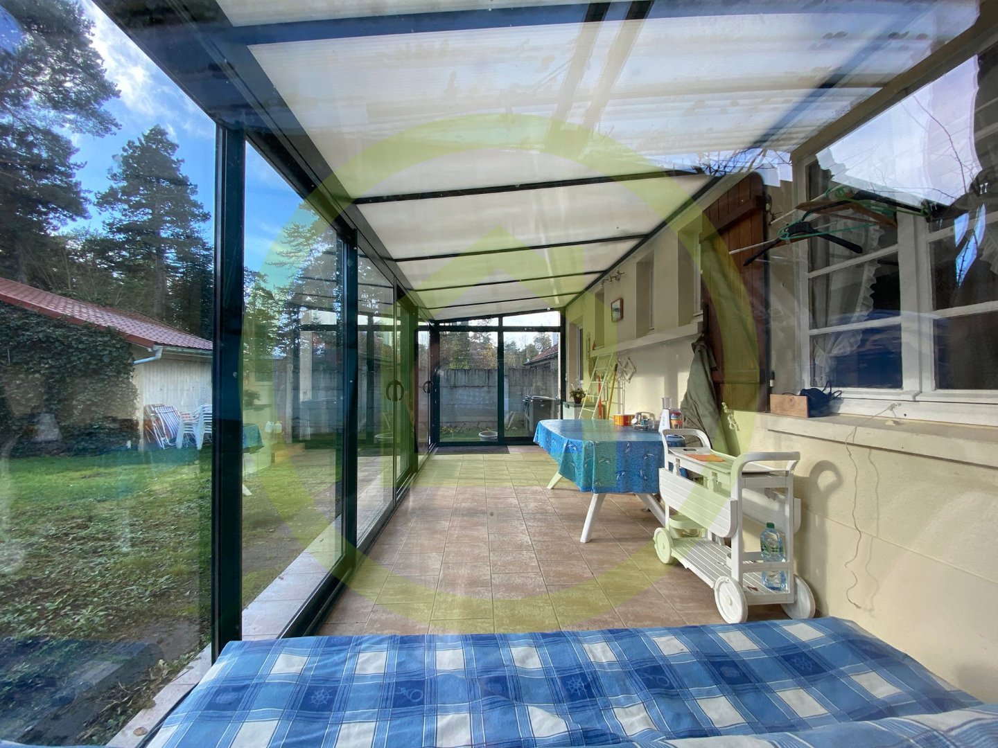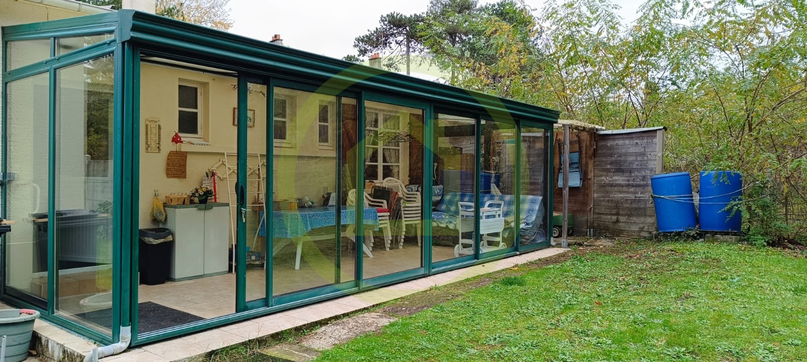Implantée sur un terrain de 786m², elle dispose d’une grande véranda non chauffée, orientée plein Sud.