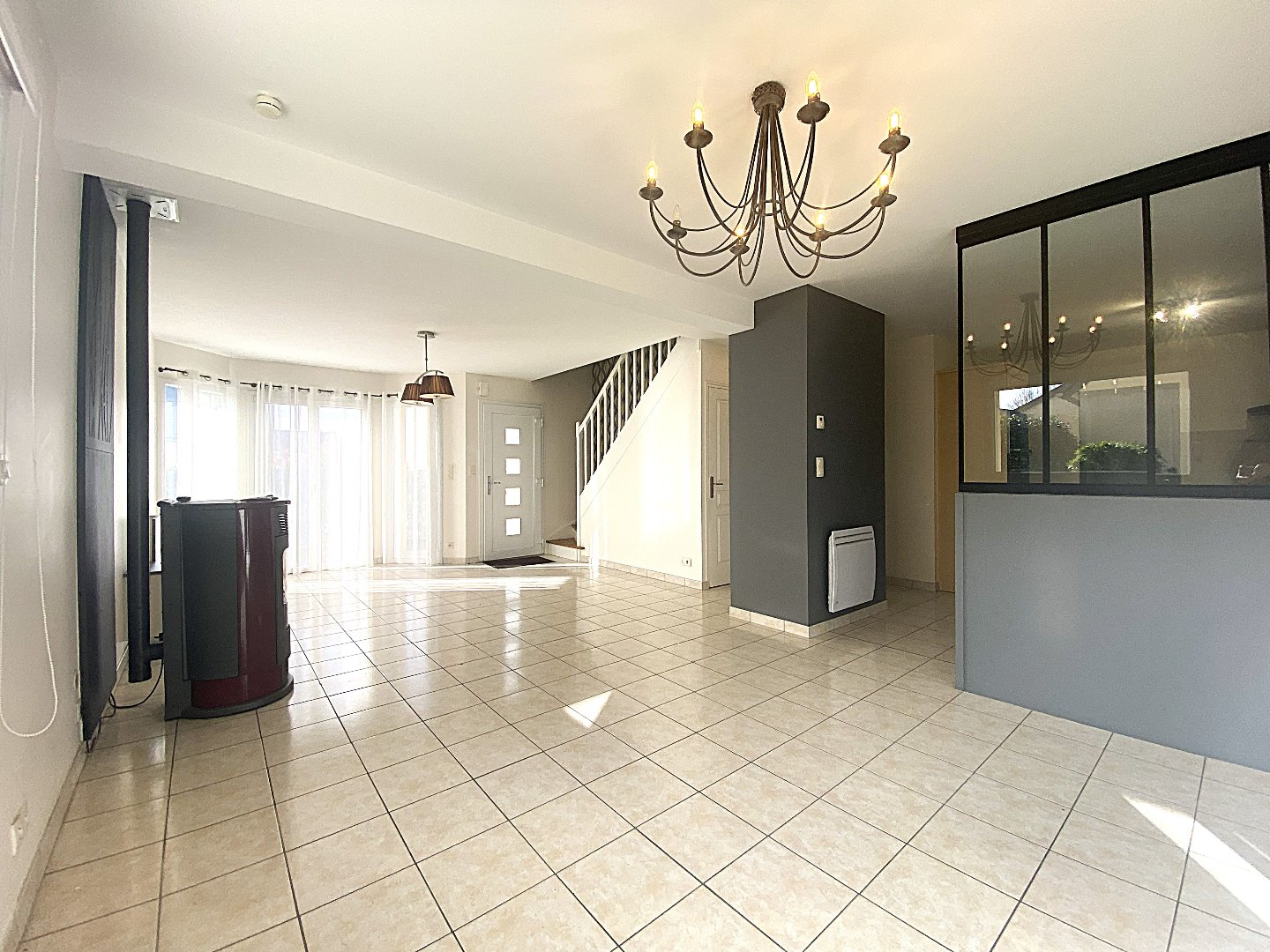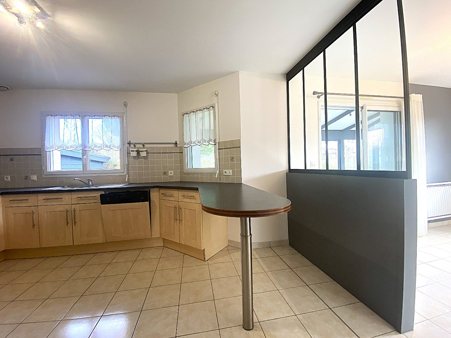 La pièce de vie, chaleureuse et parfaitement exposée, est sublimée par un poêle à granulés et s’ouvre naturellement sur une cuisine aménagée et équipée.