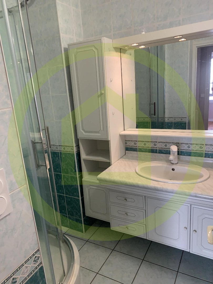 – une salle d eau composée d un meuble une vasque et d une cabine de douche .