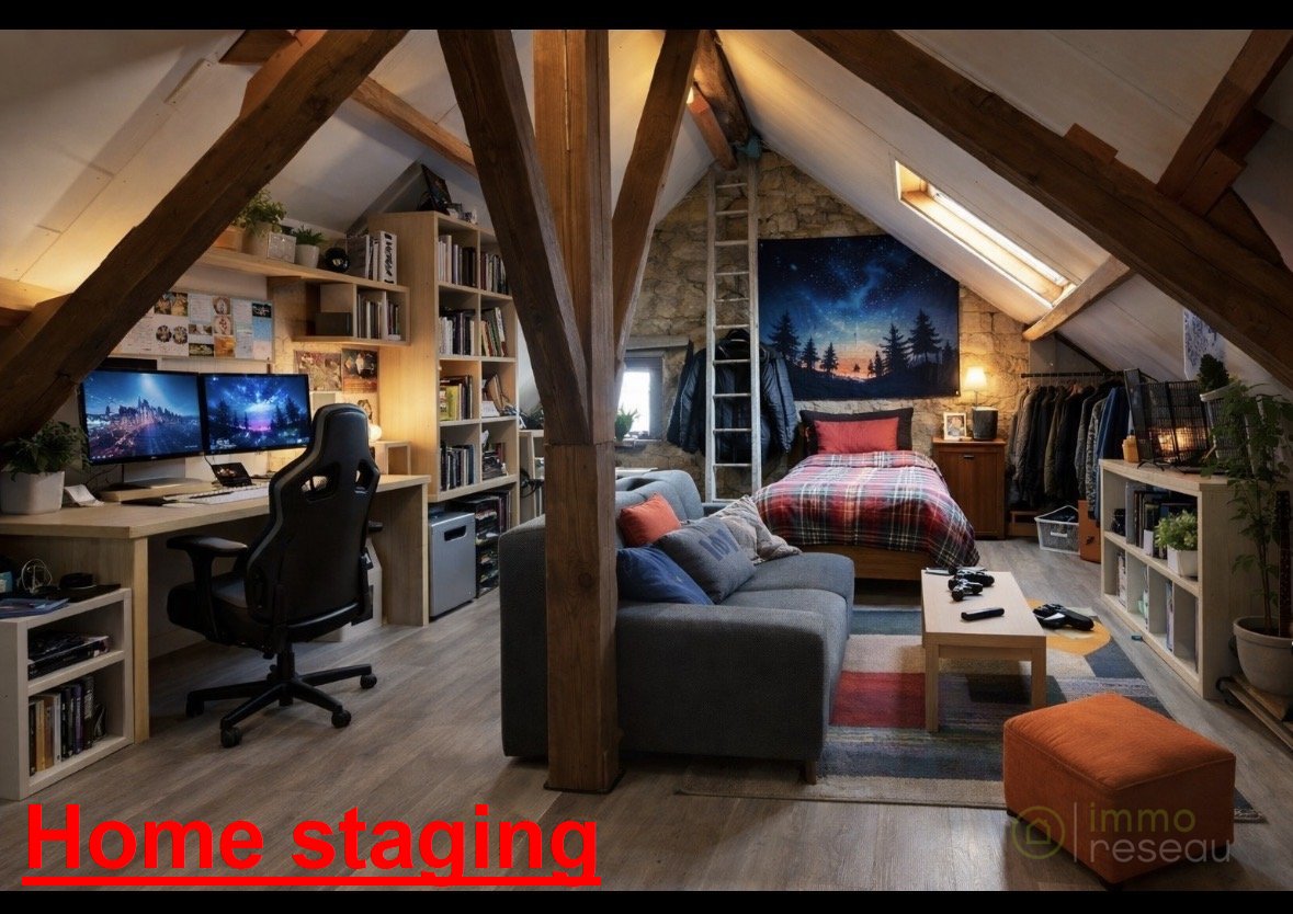 Une chambre et un grenier avec de beaux éléments de charpente offre un espace de charme (voir photos home staging)
