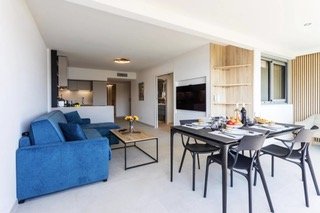La pièce de vie de 31,74 m², lumineuse et parfaitement agencée, s’ouvre sur un balcon, véritable prolongement extérieur face à la mer.