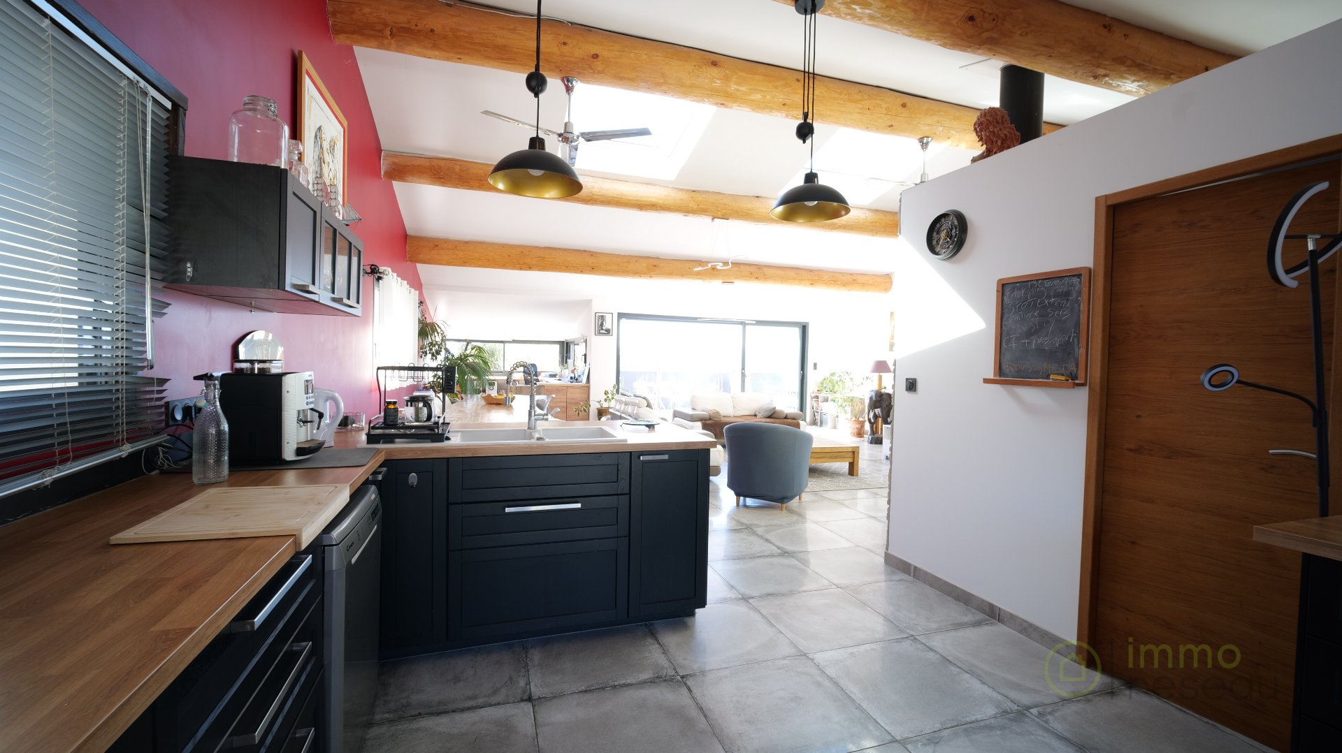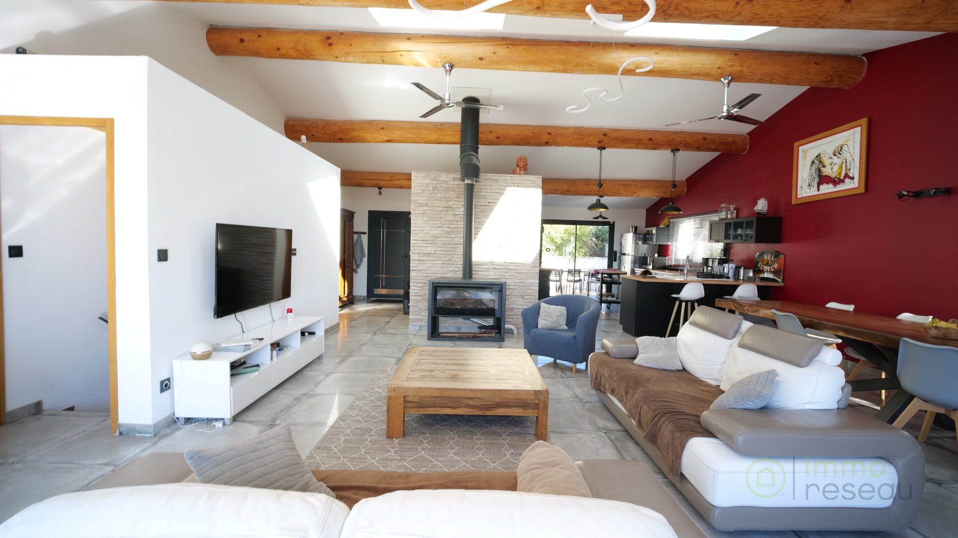 La pièce de réception, ouverte sur une cuisine haut de gamme, invite à la convivialité.