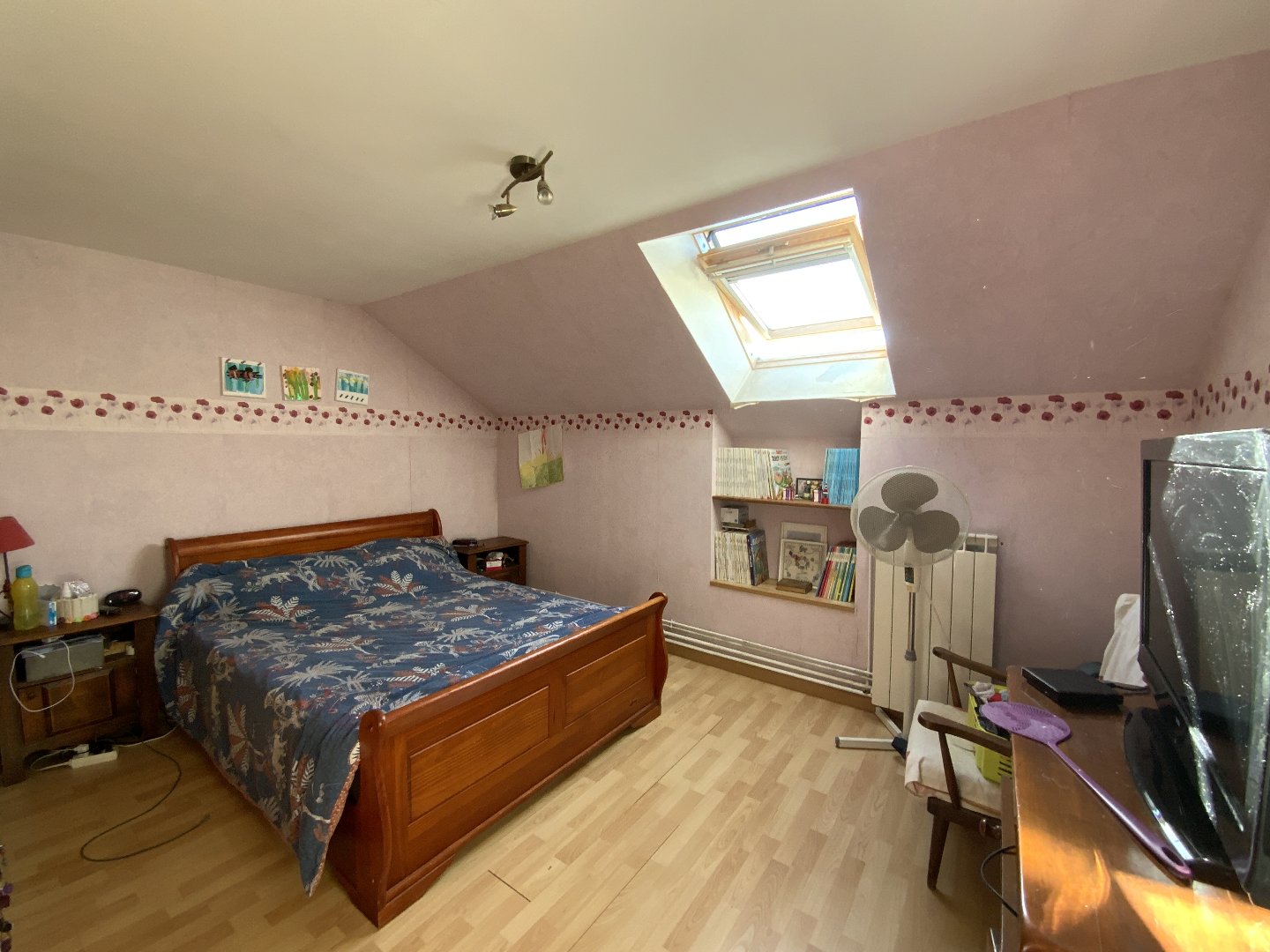 A l’étage un grand palier desservant deux chambres, une salle de bains WC.