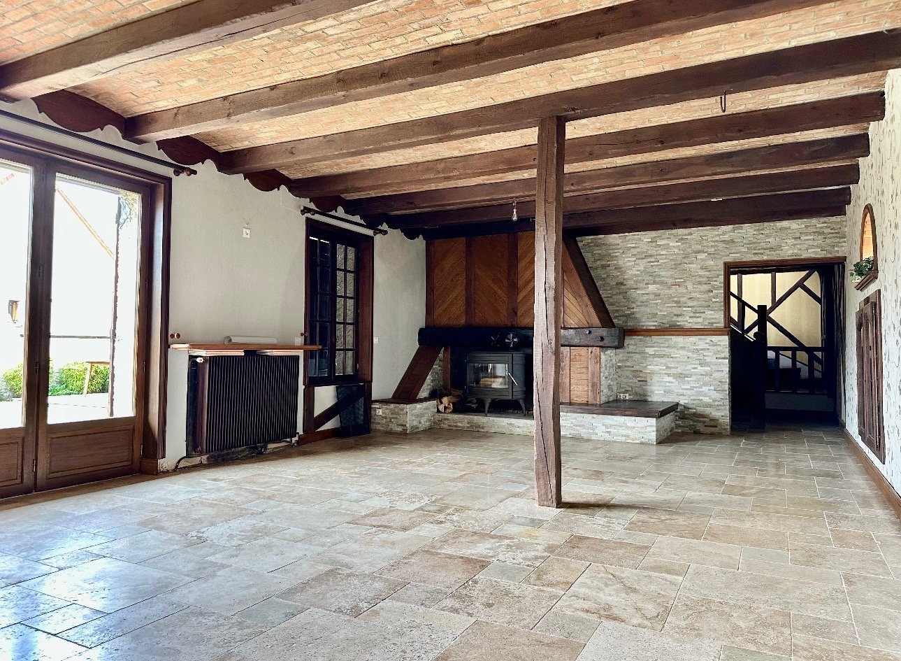 Au rez-de-chaussée, vous découvrirez une spacieuse pièce de vie, composée d’un séjour chaleureux agrémenté d’un poêle à bois, offrant un cadre convivial en toute saison, ainsi qu’une cuisine indépendante.