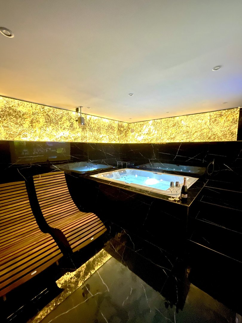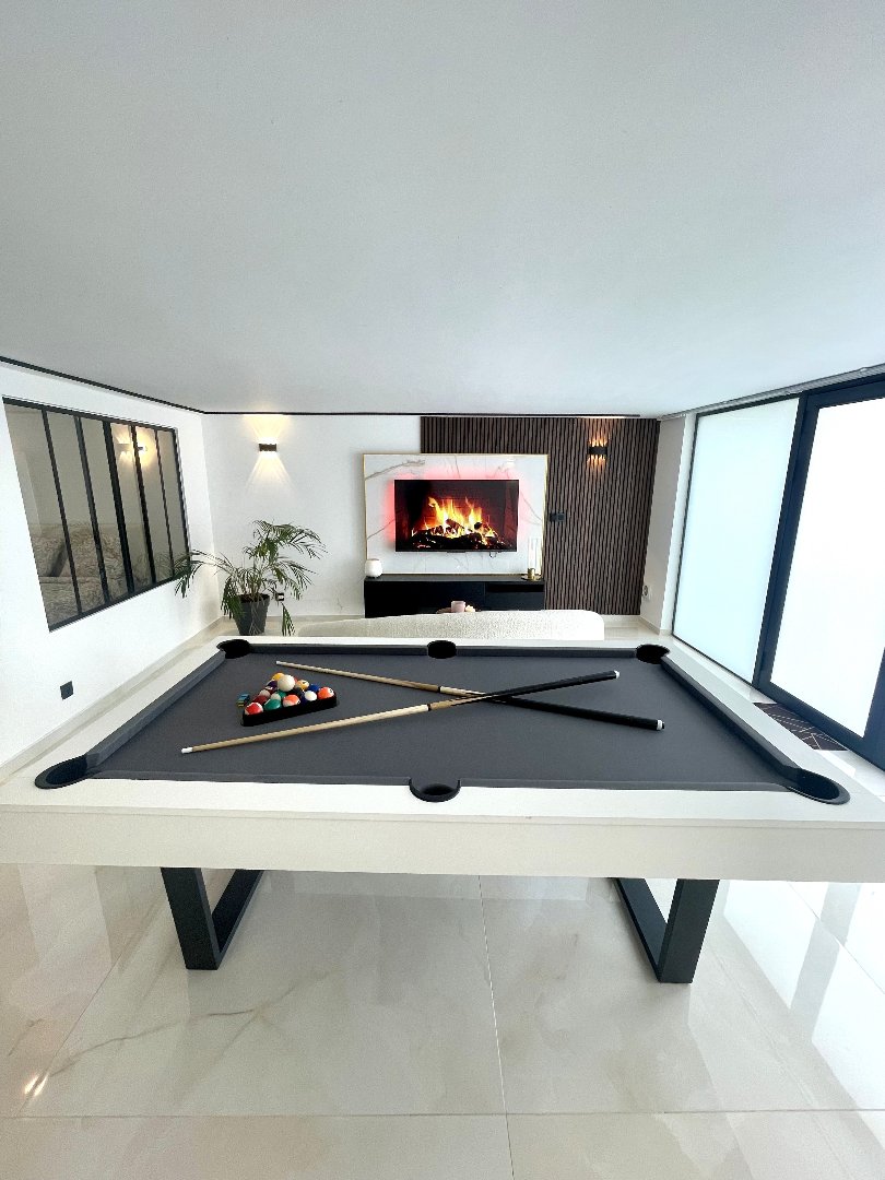 Zone détente comprenant un espace jacuzzi ainsi qu’un home cinéma et billard