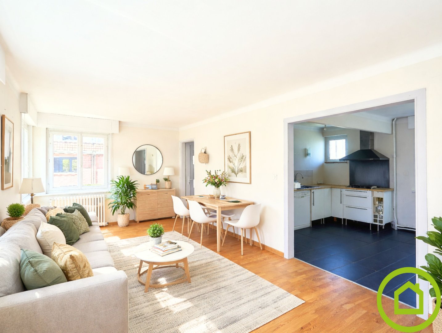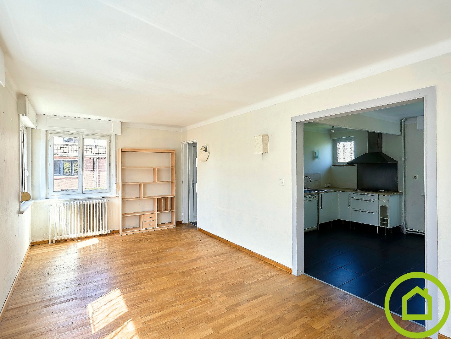 Son entrée donne sur une pièce de vie lumineuse semi-ouverte vers une cuisine équipée pour un espace global de 35m².