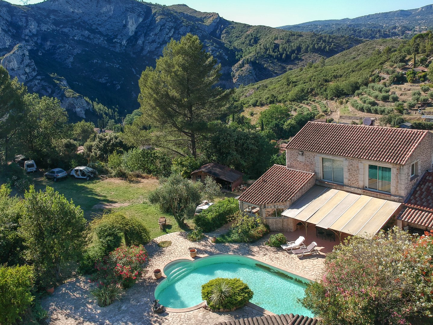 Implantée sur un terrain d’environ 15 000 m² en restanques arborées, la maison développe environ 130 m² habitables et s’accompagne d’une dépendance aménagée d’environ 20 m².