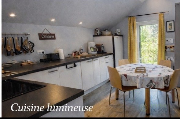 Elle se compose au rez de chaussée d’une entrée qui abrite le four à pain, une pièce de vie chaleureuse avec cheminée (27.5 m²), une cuisine lumineuse aménagée et équipée (12.5 m²), une salle de bains avec espace buanderie et wc (6.6m²).