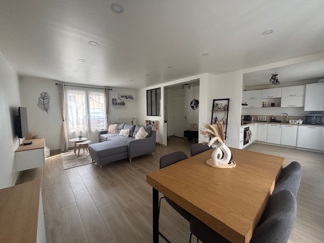 puis, un SEJOUR, SALLE-A-MANGER très lumineux avec CUISINE OUVERTE toute équipée et plaques à induction.